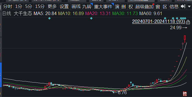 11月18晚间,大千生态发布股票交易风险提示公告称,截至2024年11月18日,公司股票再次涨停,已连续10个交易日涨停。鉴于公司近期股票涨幅较大、市盈率较高以及公司控制权变更事项的不确定性风险。
