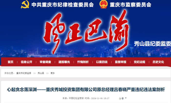 《警钟丨心起贪念落深渊——重庆秀城投资集团有限公司原总经理吕春晓严重违纪违法案剖析》