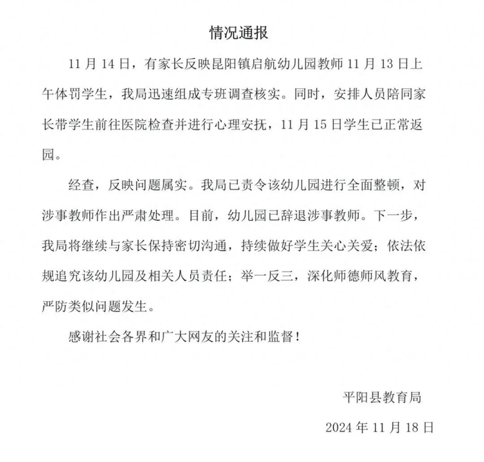 11月18日晚,浙江平阳县教育局通报“幼儿园教师体罚学生”:已辞退涉事教师,责令幼儿园全面整顿。详情如下: