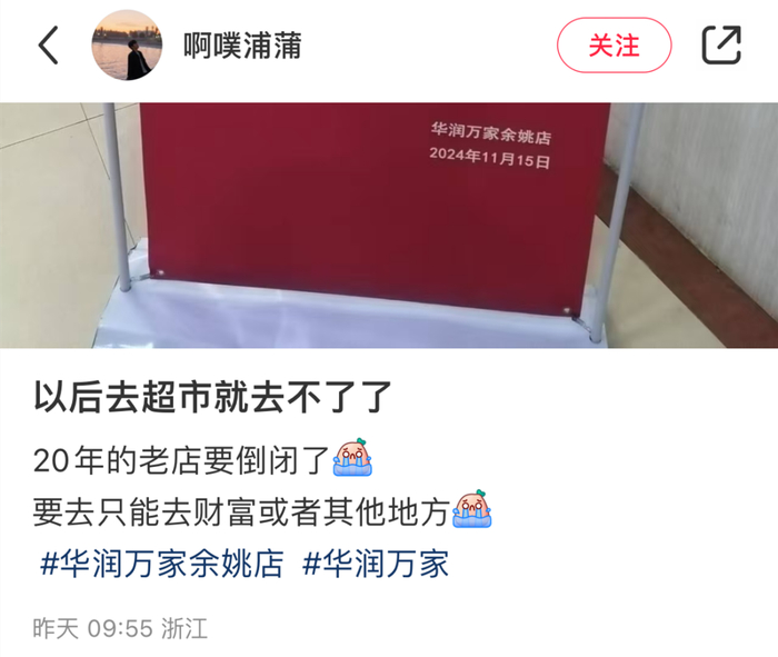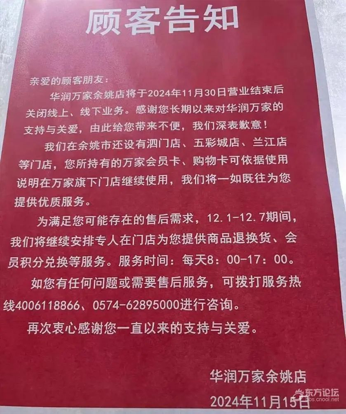 近日,有网友在宁波本地论坛发帖称,“华润万家余姚店(联盟桥),这家曾经风光无限的大型商超,将于2024年11月30日营业结束后,正式关闭其线上和线下业务。”