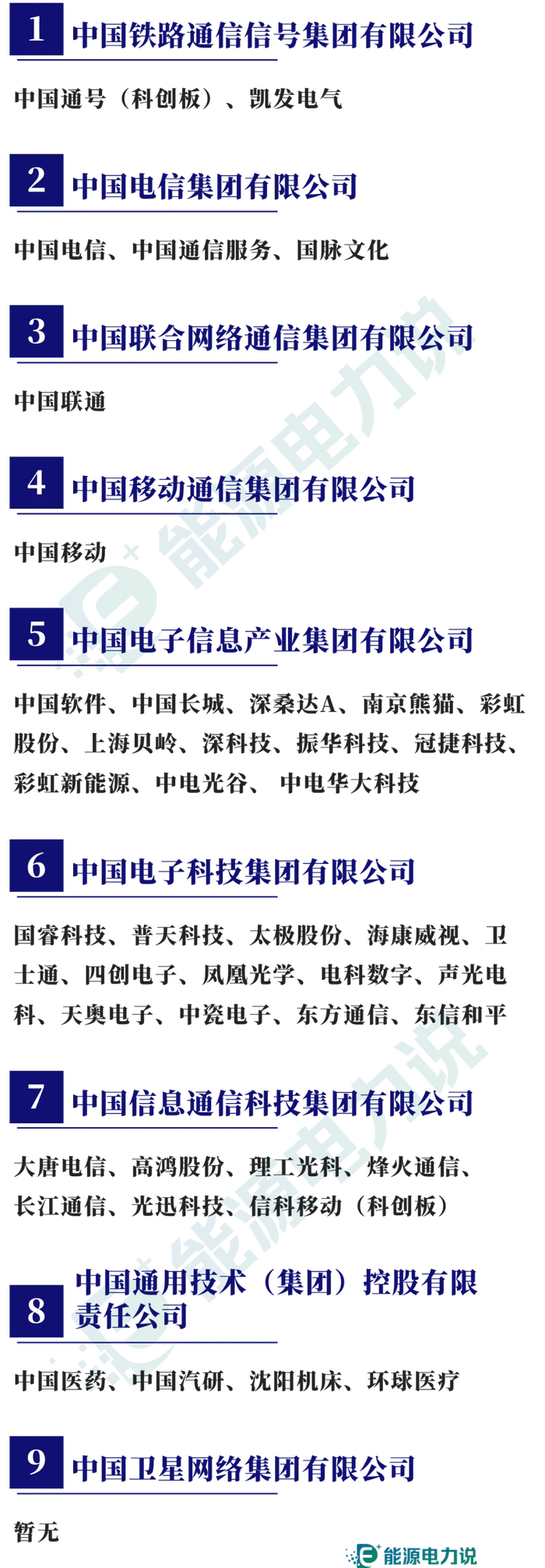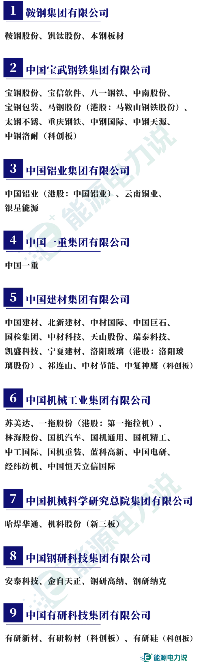 中国交建、中国铁建、中国电建、中国能建、中国建筑、中铁装配、中国中铁、中钢国际、中国化学、中工国际、中材国际、中国巨石、中材科技、中公高科、中国中治、中成股份、中铝国际、中国核建