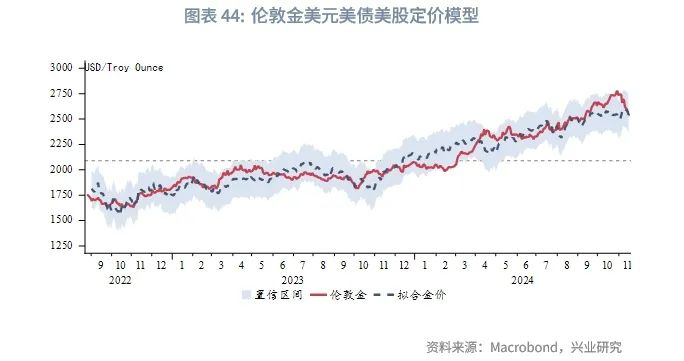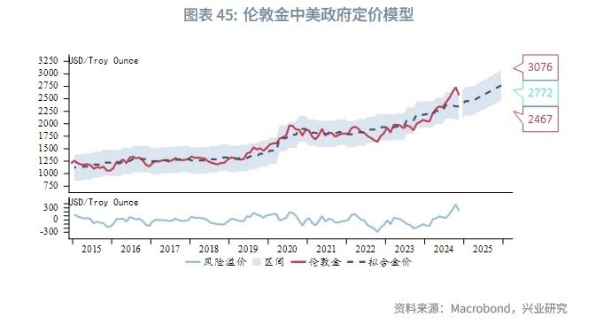 参考CBO预测的2025年美国中央政府杠杆率以及兴业研究宏观团队测算的2025年中国中央政府杠杆率,考虑2015年至今相关性情况下,伦敦金区间2467美元/盎司至3076美元/盎司,中枢2772美元/盎司。考虑2019年至今相关性情况下,区间2400美元/盎司至3118美元/盎司,中枢2759美元/盎司。