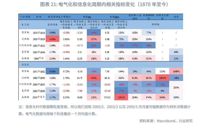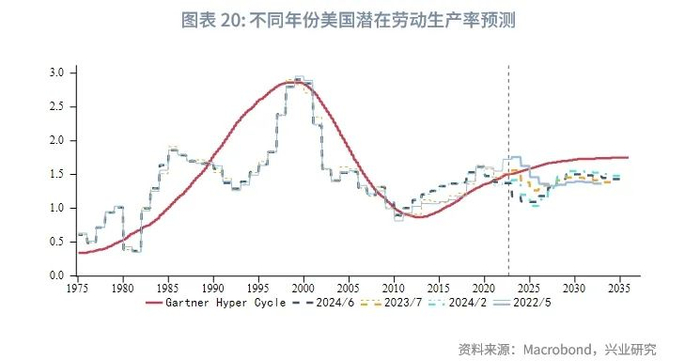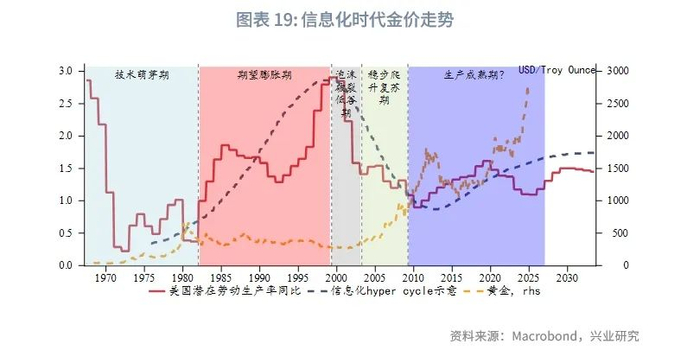 根据我们在《兴业研究商品报告:产业技术周期、美股与黄金(上)20240218》和《兴业研究商品报告:产业技术周期、美股与黄金(下)20240219》的研究,我们发现黄金大周期的强弱归根结底取决于潜在劳动生产率。新技术萌芽期,新旧技术动能交替,潜在劳动生产率低位徘徊较长时间,金价内生上涨动能强劲,这正是当前我们所处的周期。期望膨胀期潜在劳动生产率同比增速最快,也是金价在产业周期中表现最为低迷的一段时期。而随着潜在劳动生产率同比在期望膨胀期后的回落,金价进入第二段主升阶段,且这一阶段通常贯穿泡沫破裂期以及稳步爬升复苏期。生产成熟期潜在劳动率同比再度回升,但回升幅度不及期望膨胀期,金价虽然回落但回落幅度弱于期望膨胀期。生产成熟期后期代表技术对于经济增长拉动显现瓶颈,潜在劳动率同比开始回落,金价再度回升,这一回升持续至技术萌芽期。