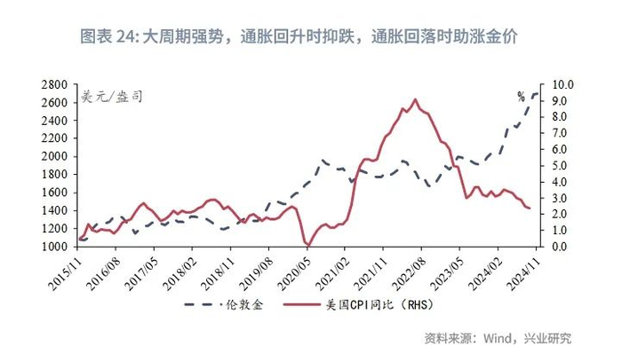 2023年10月后美国通胀数据持续回落、美联储降息预期持续发酵以及2024年9月美联储预防性50bp降息落地,是金价在大周期强势背景下过去一年流畅上涨的直接驱动。展望2025年,美国去通胀进程步入停滞并且可能阶段性回升、美联储或在下半年结束降息周期将使得金价遭遇周期性逆风。