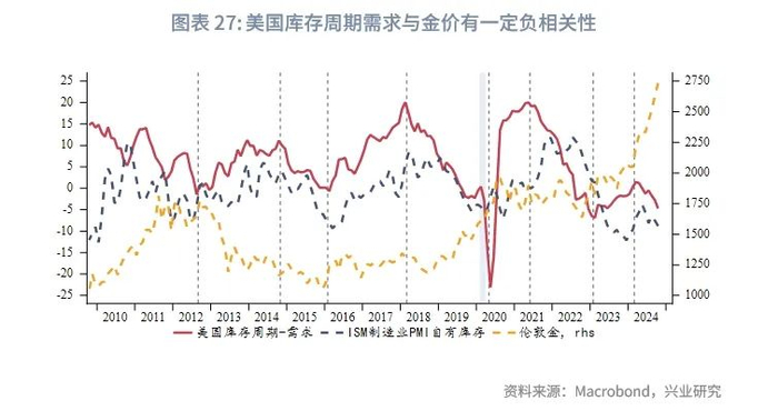 金价在投资周期四阶段以及库存周期四阶段的表现规律性相对不明显,不过与美国私人投资增速变动以及库存周期需求项呈现一定负相关。即在私人投资增速下行时金价多倾向于上涨,私人投资增速上行时则呈现下跌或震荡(也有少数时期上涨,多发生在金价大周期强势的时期)。库存周期需求下行时金价多倾向于上涨,反之则呈现下跌或震荡(与大周期是否强势有关)。2025上半年美国第二库存周期需求延续探底,可能有利于金价的表现,但下半年第三库存周期需求回升或对金价形成压制,不过幅度相对有限,且上海金走势更需要考虑美元兑人民币走势的影响。2023年1月至2024年7月,处于美国第二库存周期需求回升阶段,伦敦金在初期表现相对震荡,后仍然大涨,上海金则因为美元兑人民币的走强,在第二库存周期需求回升阶段一直表现偏强。