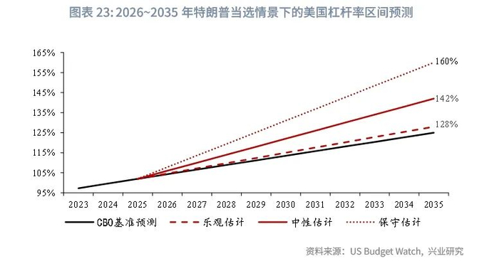 美国方面来看,特朗普重返白宫,预期其任内推行的政策或将进一步推高美国杠杆率。2024年,美国中央政府债务规模占国内生产总值(GDP)的比例约为99%;根据国会预算办公室(CBO)的基准预测,美国中央政府债务占GDP比重将从2026财年的102%增长到2035财年的125%。然而,美国独立财政监督组织“负责任联邦预算委员会”(CRFB)旗下“美国预算观察”(US Budget Watch)项目根据特朗普前期竞选时宣布的政策,评估可能的公共支出和收入水平后,认为2026~2035年美国国债杠杆率或将高于CBO预测的基准杠杆率。特朗普重返白宫影响下,美国中央政府杠杆率在2035年或升高至142%。