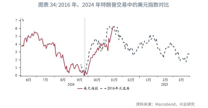 假设明年上半年便出现政策冲击导致的再通胀,而经济表现较弱,则美国宏观环境类滞胀。此种情景下,美联储大概率会继续降息避免经济衰退,相对利差收窄。同时,美国去通胀进程相对放缓,美元指数表现偏弱。待下半年经济企稳后,美联储暂停降息,叠加再通胀,市场甚至可能期待美联储再加息,carry trade将推升美元指数。如此全年美元指数先弱后强。