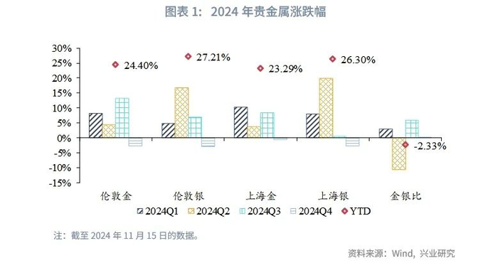 截至11月15日收盘,2024年伦敦金累计涨幅为24.40%;伦敦银累计涨幅为27.21%;上海金累计涨幅为23.29%;上海银累计涨幅为26.30%;金银比回落2.33%。