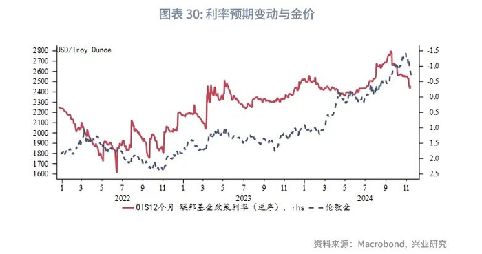 2024年金价涨幅在主要大类资产中居于首位,较2023年的涨幅扩大。主要经济体债务继续扩张、潜在劳动生产率同比下滑以及地缘冲突频发奠定了金价强势的大背景。2023年10月后美国通胀持续回落、美联储降息预期发酵以及2024年9月美联储预防性50bp降息落地,提供了过去一年金价流畅上涨行情的直接驱动。步入2024年10月,美国去通胀进程陷入停滞,以及特朗普当选后其反移民、对外加征关税、对内减税的政策均可能推高通胀,美联储降息预期快速收敛,金价高位回落。