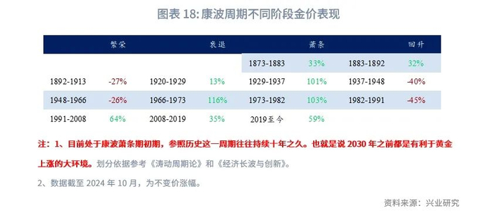 党的二十大报告“我国发展进入战略机遇和风险挑战并存、不确定难预料因素增多的时期”,准确刻画了当前宏观大环境的变化。全球经济自2019年起开始进入康波萧条期,即新旧技术交替时期,这一周期往往持续十余年之久,也就是说可能要到2030年左右康波萧条期才会结束。康波萧条期的典型特征是:该轮技术周期中的代表技术对于全球经济增长的拉动进入瓶颈期、全球进入切存量蛋糕时代、区域动荡以及地缘政局博弈加剧,主要经济体往往会存在较为严重的债务问题,传统投资品种收益率下降。在这一时期,科技方面往往会涌现许多重要的发明或者创新,但通常只有经历较长的渗透和发展阶段,在下一个长期上升阶段开始时才能得到大规模的应用。由于超主权货币属性得以体现,金价在康波萧条期中表现亮眼,历史上康波萧条期上涨概率100%,是黄金长牛走势中的主升浪阶段。