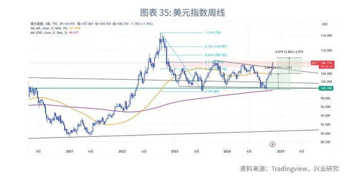 从美国高频基本面反映的经济小周期而言,2024年末可能是经济小周期由强转弱的窗口期,2025年年初经济小周期下行的可能性较大。并且当前美元指数已经相对高频基本面高估,也在积累回调压力。2016年大选和2024年两次特朗普交易中的美元指数走势高度类似,似乎也表明美元指数很可能在近期触顶,在2025年初转弱。总体而言,2024年11、12月是美元指数筑顶窗口期的可能性较高,2025年美元指数可能弱势开局。此后节奏取决于美国经济数据、特朗普经济政策的组合。技术上,美元指数在107一线有较强阻力,若突破,以60周均线为中枢,1:1区间的上行目标在108附近;更高阻力在此前下行趋势0.618回撤的108.7附近。104、100则是重要支撑位。