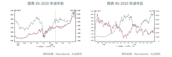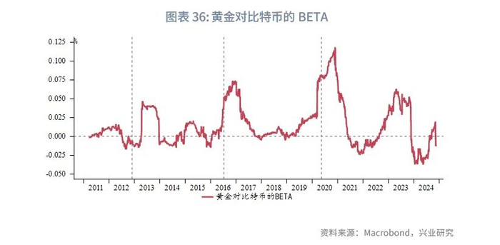 长期看,比特币与黄金相关性并不稳定,不过在每次比特币供给减半前后其与黄金存在较高的正相关性。从黄金对比特币的BETA来看,呈现较为明显的周期性波动特征,在以往比特币供给减半前一个月左右(2012年11月28日、2016年7月10日和2020年5月12日),黄金对比特币的BETA往往会快速上升,并在供给减半后4到6个月左右达到最高后回落,此后多转为负相关。2024年比特币供给减半日为4月20日,2023年底至2024年初比特币的大涨符合以往比特币供给减半前后的走势,同时在供给减半前后也往往是需求端的利好信息、监管态度的阶段性放松,对于加密货币合法化以及替代法币的炒作高涨的时候。2024年3月至4月黄金价格的大涨也与比特币1月大涨后,资金买入低估的黄金(相较于比特币而言)有一定关联。而近期比特币与黄金已经转为负相关,更多通过反映市场风险偏好的提升来与金价产生负相关性。