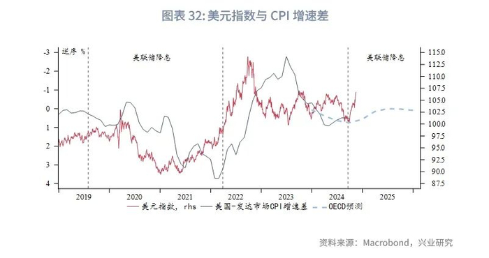 假设明年政策出台较晚,上半年没有明显再通胀,则去通胀进程延续。根据当前OECD季度经济预测计算,在不考虑特朗普政策影响的情况下,2024年第四季度开始,美国相对发达市场的CPI增速差将有所回落,即美国CPI相对更明显降温,美元指数受到支撑。下半年政策落地叠加经济边际好转,市场预期美联储暂停降息甚至未来再加息,carry trade主导美元偏强运行。如此可能全年美元指数表现都较强。