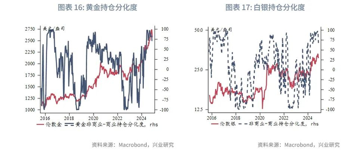 节奏上来看,近期特朗普政策带来通胀回升担忧、美联储降息预期收敛、特朗普在美国参议院中的盟友建议售金购买比特币等带动过去一两周金价快速走低,黄金风险溢价回落至合意区间。今年底至明年上半年美国需求可能继续走弱,美元利率汇率阶段性回调或带动金价再度反弹。2025下半年美国需求可能回升、特朗普政策实施后或推升通胀、美联储结束降息均会打压伦敦金。伦敦金未来一年震荡幅度相较于过去一年或将明显放大,而上海金则可能因为汇率因素表现偏强。总体而言,近期黄金回调提供再度介入窗口,但建议降低对于未来一年收益预期,历史来看连续两年录得大幅正收益后,第三年呈现震荡的概率上升。