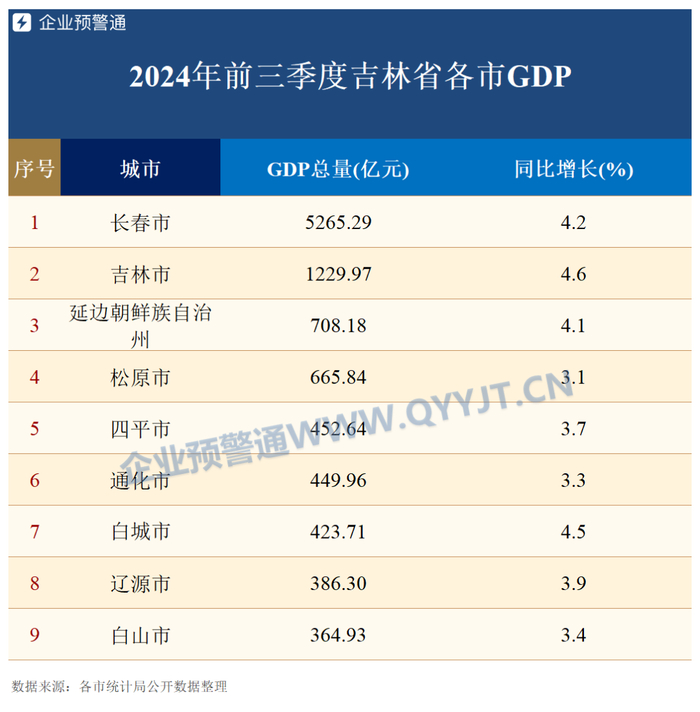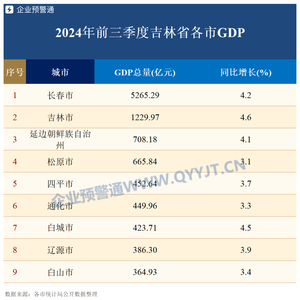 从增速来看,吉林的9个城市在前三季度GDP均保持正增长,3市的GDP增速高于全省,分别是吉林、白城、长春。