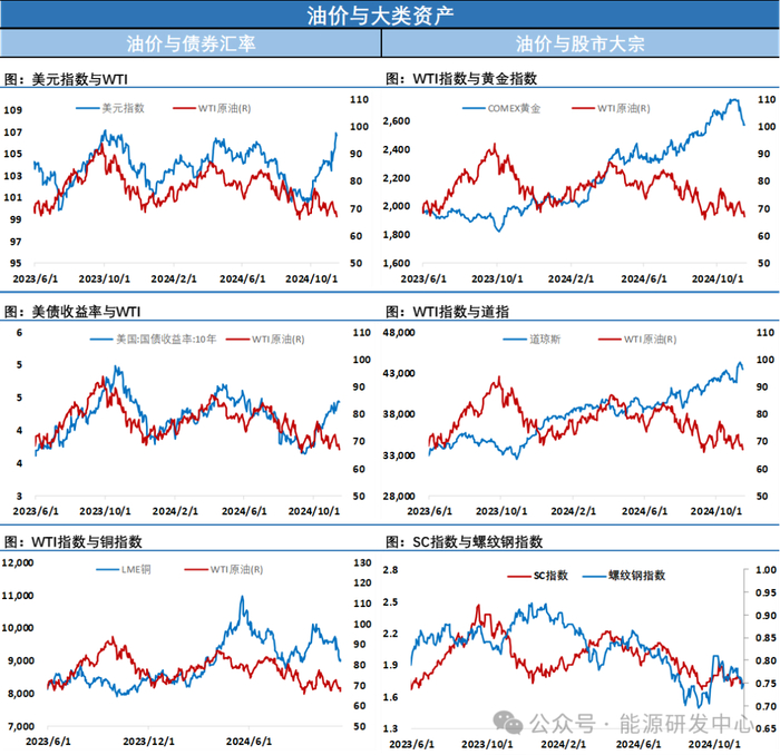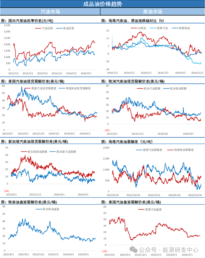 另外市场仍在评估特朗普对能源市场可能带来的影响,一方面总统特朗普提名克页岩油革命的先驱之一里斯·赖特(ChrisWright)担任下一届能源部长,并表示将设立国家能源委员会来推动美国的能源生产。另一方面有诸多迹象显示特朗普将对伊朗重拾制裁,伊朗方面近期有主动缓和关系迹象,对与即将上任的特朗普政府进行谈判持开放态度,同时警告这位当选总统,任何试图对伊朗重新施加“最大压力”的企图都将无法换取伊朗的让步。最终美国的伊朗的态度无疑对原油市场来说后续是一个影响较大的不确定性因素。另外美国总统拜登的政府允许乌克兰使用美国制造的武器深入俄罗斯境内进行打击,也引发的俄罗斯的高度不满,俄罗斯方面对此也发出来威胁言论,这也给俄乌战争能否在明年顺利结束蒙上阴影