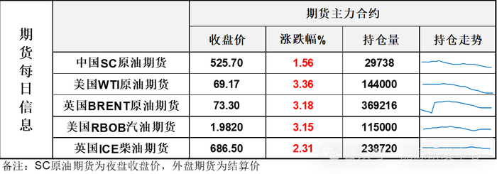 1WTI主力原油期货收涨2.25美元,涨幅3.36%,69.17美元/桶;布伦特主力原油期货收涨2.26美元,涨幅3.18%,报73.3美元/桶;INE原油期货收涨1.56%,报525.7元。