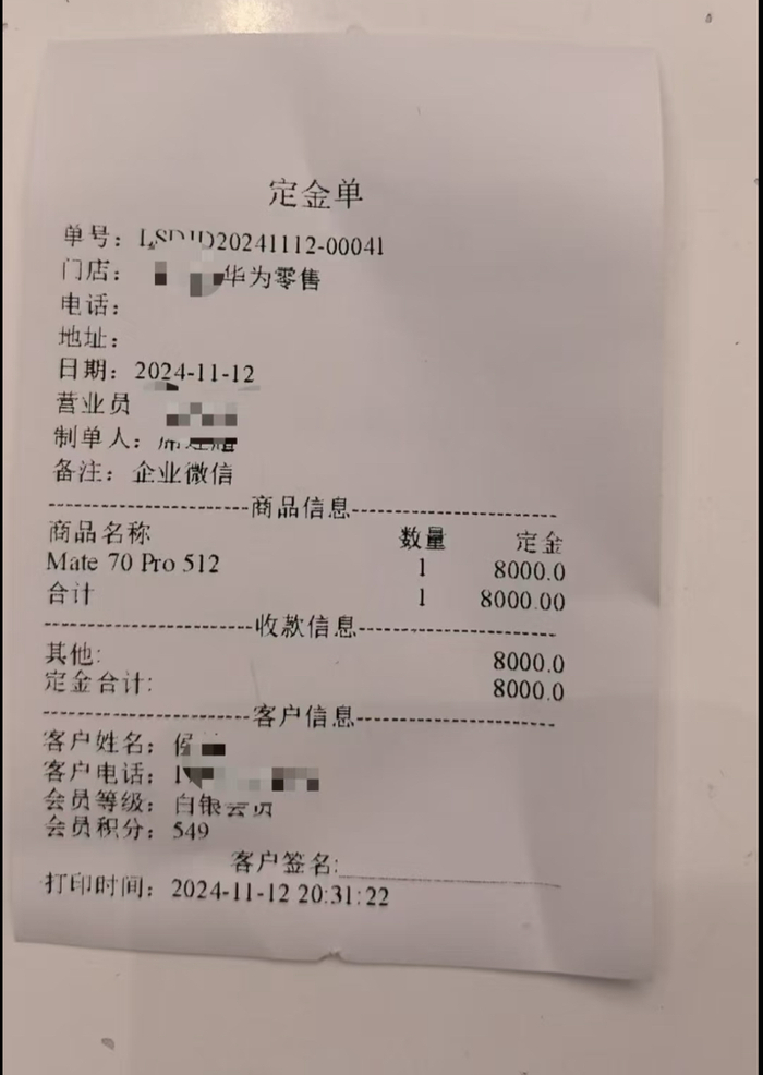 有西安的消费者则对《科创板日报》记者表示,上周11月12日就有销售联系他,并表示Mate70系列的先锋计划已经开启了。这名消费者预付了8000元定金预订了Mate70 Pro 512GB版本。“正式售价他们没有透露,但销售心里肯定有数,正式售价应该相差不多。”