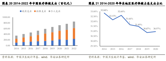 医疗保健支出高速增长,华东地区市场巨大。我国医疗保健总支出从2014年的35312亿元增至2022年的84847亿元,2017-2022 CAGR 10.04%,医疗保健支出的持续增加为口腔医疗服务需求的持续扩大奠定了基础。从区域划分来看,华东地区医疗健支出占比较高,虽然近年来占比有下降趋势,但自2014年以来始终保持30%以上,华东地区口腔医疗服务市场的活跃需求可见一斑。扎根于华东地区的企业面对更广阔的地区消费力,将有望获得更高的业绩增长景气度。