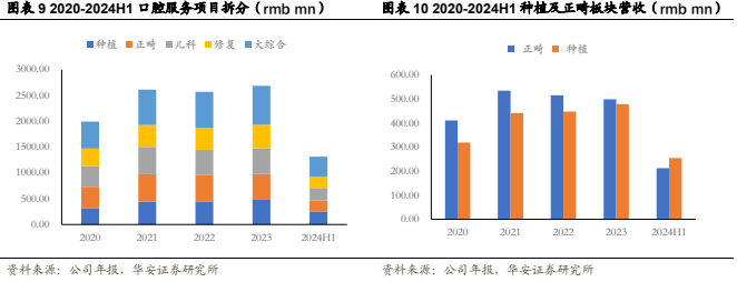 口腔医疗为公司最主要的收入来源。拆分收入结构,医疗服务板块可以细拆为口腔医疗服务和辅助生殖服务,2022年后辅助生殖业务不再并表,24H1公司实现口腔医疗服务收入13.14亿元,是公司最主要的收入来源,稳健增长。
