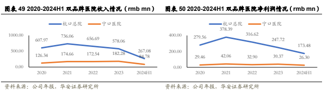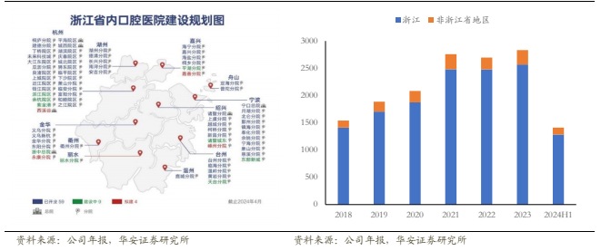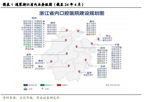 公司采用“总院+分院”模式进行医院运营管理,积极打造深耕浙江、辐射全国的集团品牌。在省内,公司在浙江省内已经拥有杭口平海区域集团、杭口城西区域集团、宁波口腔医院集团、杭口绍兴区域集团和杭口浙中区域集团5家口腔区域集团,由此扩张分院,形成多个“区域总院+分院”区域医院集群,截至24年上半年,杭口、宁口在浙江省内开业机构已有63家,且有10余家正在筹建。此外公司采用蒲公英计划进入省内下沉市场,截至2023年年底蒲公英已开业41家,2024年计划新增8家,部分医院在建设中,部分医院已完成选址;50%的蒲公英医院实现盈利,50%处于孵化培育期。蒲公英医院规模均在30-100张牙椅之间(对应医生25-85名之间)。此外,公司通过并购探索省外机会,2023年收购娄底口腔医院股权,并通过参与口腔医疗基金在武汉、西安、上海等地投资建立口腔医疗机构。
