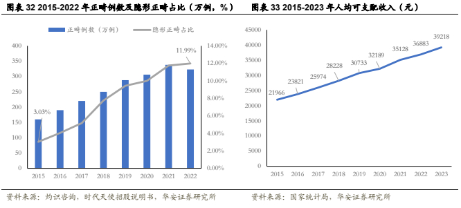 “爱美之心”推动正畸需求增大,潜在需求随消费能力的提高而逐步转化。2015-2022年,中国的正畸数量从160万例上升至323万例,正畸项目渗透率快速提高。其中,出于对日常生活的考量,不影响美观的隐形正畸案例的占比不断提高,从2015年的3.03%提升至2022年的11.99%,是正畸市场扩容的坚实基础。与此同时,人均可支配收入的上升为价格更高的隐形正畸的普及创造了可能性,未来随着经济环境和消费能力的逐步恢复,正畸市场仍大有可为。