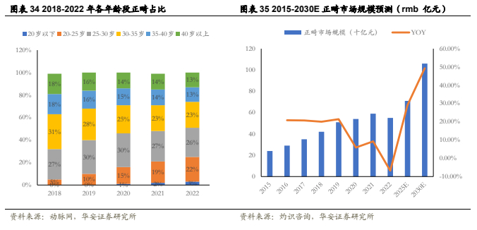 中青年人群为正畸主力,女性占比更高。主力正畸人群集中在24-34岁阶段的成年人种,并向低龄化和成熟化两端延伸。各年()龄段正畸人群中,女性正畸的数量明显高于男性,2022年占比约为61%,近年来男性占比在逐步增加,同时20-35岁年龄段占人口数接近七成,口腔医疗消费持续年轻化;这与女性追求完美的心态不无关系。多因素驱动下,预计正畸市场规模将高速发展。未来随着经济的逐步恢复,正畸需求与市场规模有望持续稳定增长。
