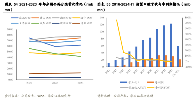 总院发展稳健,贡献大部分利润。总院定位为当地规模、水平均领先的医院,由区域总院平台对医生医疗服务技能、学术地位形成支撑,并在区域内形成品牌影响力。2023年,城西、杭口和宁口三大总院收入分别为4.18亿元、5.78亿元和1.82亿元,同比下降10.53%、11.97%和增长5.65%。2023年三大总院所占利润达74.02%。2024年上半年城西口腔医院实现营收1.92亿元,净利润7731万元。