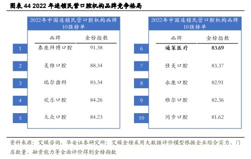 市场集中度较低,竞争仍处蓝海。根据艾媒金榜指数,在2022年最新发布的连锁民营口腔机构品牌十强榜单中,通策医疗获得83.69的评分,排名第六。泰康拜博口腔以91.38的金榜指数摘得桂冠;美维口腔、瑞尔齿科分别以88.34、85.34的金榜指数位列第二、第三名。