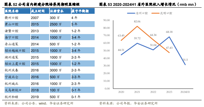 分院发展迅猛。作为总院的“护城河”,分院可将品牌影响力快速推开,实现医疗资源的优化及客户就诊便捷,在较短时间内积累客户资源、获取市场份额。近年来,各地分院增速显著上升,诸暨口腔收入于2023年达1.23亿元,同比增长14.81%。同时,省内新建分院培养周期显著缩短,盈亏平衡期已经逐步下降至0-1年。省内总院分院发展不断为省外扩张助力,省外医院中沧州口腔近四年营收逐年上升,随着公司省外并购逐步推行,凭借着在省内模式下构筑的品牌基础,能够进一步加速在其他省市的口腔布局,扩张品牌规模。
