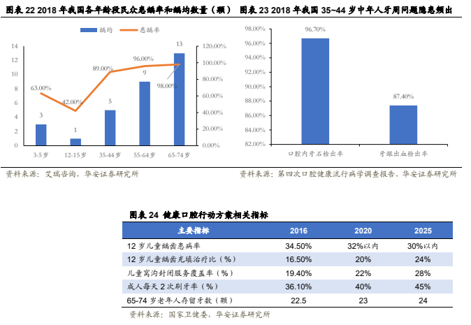 口腔保健意识基础较弱,国家重视口腔问题。根据我国第四次流行病学调查的数据(2018年),我国各年龄段人群均面临程度不一的口腔问题,口腔医疗服务存在大批潜在需求。在此基础上,国家卫健委提出《健康口腔行动方案(2019—2025年)》,对各年龄段人群都提出了口腔治疗的相关目标。供给端的边际放松也对行业发展提供了便利,利好政策的持续落地也将促进口腔医疗机构逐步发展。