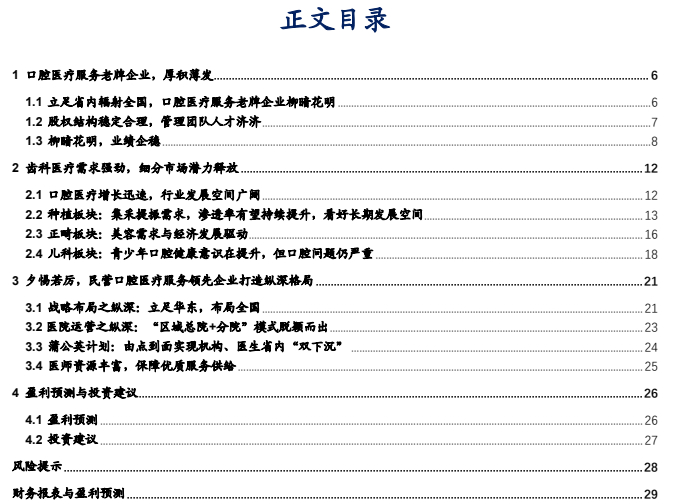 公司作为以医疗服务为主营业务的主板上市公司,经营持续向好。通过“区域总院+分院”的模式,公司打造了有口皆碑的医院品牌,医疗资源优势显著,通过蒲公英进行省内加密及分院建设,新增口腔医院达到盈亏平衡的速度远超过同行业其他公司,达到总院盈利能力强,蒲公英医院稳步持续扩张的状态。公司已逐渐走出政策扰动带来的业绩压力,我们认为公司长期发展可期。我们预计2024~2026年公司将实现营业收入29.49/33.22/36.76亿元(+3.6%/12.7%/10.7%)将实现归母净利润5.68/6.65/7.62亿元(+13.4%/17.2%/14.6%),首次覆盖,给予“买入”评级。