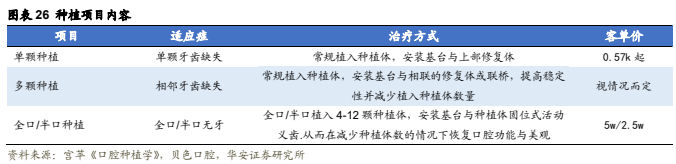 种植价格由诊疗费用、种植体、人工牙冠和基台构成,其中诊疗费用占比最高。种植体是种植牙核心部分,主要功能为上部修复体提供固位支持,种植体材质通常为钛/钛合金,能够与人体骨组织发生骨结合。基台则是种植体与修复体的连接部分。修复体负责恢复咀嚼与美观,其通常分为金属、烤瓷、全瓷三种材质。业务则根据适应症的不同分为全/半口种植、单颗种植和多颗种植。