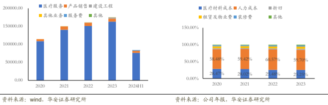 “总院+分院”模式优化库存管理。公司成本可分为医疗服务、产品销售、建设工程、其他四个方面,其中医疗服务成本占比最高,2023年占比高达93.39%。在医疗服务成本中,医疗材料成本占比逐年降低,由2020年28.47%降至2023年25.25%,2022年公司人员处于扩张期,人力成本的占比提升至60.57%。公司不断强化供应链管理,集中采购,优化库存管理,降低了药品和耗材的成本,同时通过医生参股形式,提高工作效率又降低了人力资源成本。