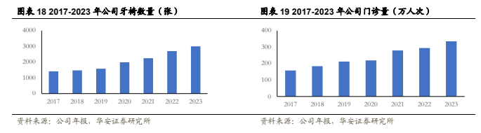 细分领域均衡发展,种植正畸业务步入成熟期。拆分结构,公司收入可以分为种植、正畸、儿科、修复等业务板块,2023年全年各业务板块分布均匀,大综合板块较为突出,占比28.11%,种植17.81%,正畸18.56%,儿科18.58%,修复16.64%。2023年受经济恢复不及预期、政策等因素影响,公司正畸、儿科占比有所降低,种植、修复、大综合板块实现增长。受种植牙集采政策影响,2022年种植板块营收4.48亿元,同比增长1.47%,增速有所放缓,2023年4.79亿元,同比增长6.95%,企稳回升。公司积极应对集采影响,提出高中低口腔超市的概念,提升市场占有率,不断提升患者就诊体验,业绩企稳恢复。2023年公司种植5.3万+颗,同比增长47%,量增明显。