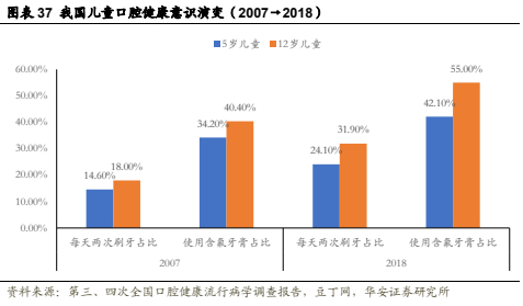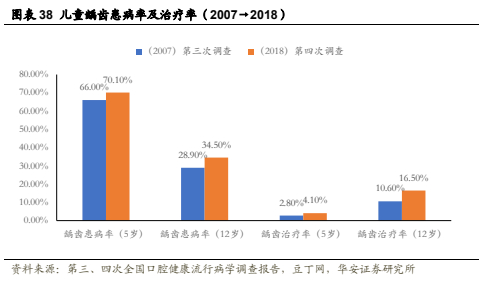 近年来青少年口腔意识不断提高。2018年《第四次全国口腔健康流行病学调查报告》显示,2007~2018年间,青少年两次刷牙率、使用含氟牙膏率均有明显提高。但儿童口腔问题仍不容小视,相比十年前的第三次全国口腔健康流行病学调查,青少年龋齿患病率和治疗率反而有所上升,因而儿科口腔业务潜在需求逐步扩大,儿齿市场潜力无限。