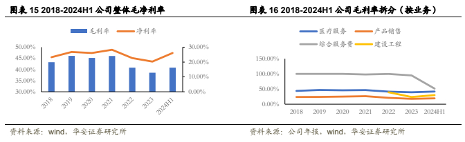 盈利能力持续增强,毛净利率稳步提高。公司整体毛利率从2018年的43.29%提升至2021年的46.06%,受消费降级及种植牙集采影响,由46.06%降至2023年的38.53%,但公司迅速适应政策变化、及时调整业务发展模式,2024H1毛利率40.83%,企稳回升。公司整体净利率从2018年的23.23%上升至2021年的28.27%, 2023年承压至20.32%,24H1净利率26.06%,回升明显,盈利能力领跑行业。拆分毛利率结构,2024上半年公司医疗服务业务毛利率41.82%、产品销售业务毛利率19.08%。