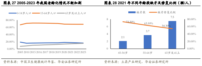 缺牙率与年龄成正比,人口老龄化驱动种植业务发展。我国人口老龄化的趋势逐步显现,65岁以上人口从2005年的7.13%已经达到2023年的15.4%,而种植需求低的0-14岁人口占比从2005年的18.8%下降至2023年的16.3%。人口结构的改变意味着持续扩大的潜在需求,65岁以上人群缺牙数显著高于65岁以下人群,达到7.5颗/人,同年龄段缺牙修复比例占54.30%,依旧存在一定提升空间。