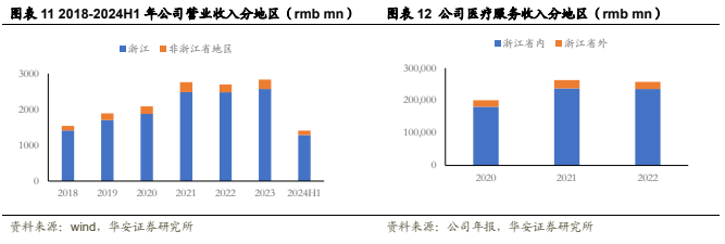 深耕浙江,辐射全国。公司以浙江为大本营,2023年在浙江省内实现营业收入25.68亿元人民币,22年同期24.80亿元人民币(其中浙江省内实现医疗服务收入23.56亿元),浙江省内贡献90.68%的营收,是公司业绩的主要来源,未来公司通过省内总院的稳定发展、分院的持续爬坡,以及省外的外延并购机会,将有望保持长期稳定增长的趋势。