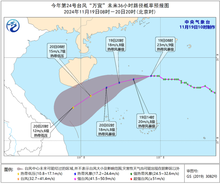 今年第24号台风“万宜”今晨进一步减弱为热带风暴级,今早8时其位于海南省三沙市(西沙永兴岛)东北方向约315公里的海面上,中心附近最大风力9级(23米/秒)。预计,“万宜”将以每小时15~20公里的速度向西偏南方向移动,逐渐向海南岛东部海面靠近;随着海温降低、垂直风切变增大以及干冷空气侵入等因素影响,未来它将快速减弱,可能于20日下午在海南东南部海面消散。受冷空气和“万宜”共同影响,华南及南海有风雨天气。