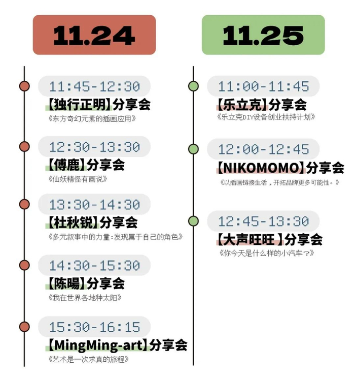 本届艺术节更有「尖峰论坛」版块,将举办超20场的分享会、签售会等。观众在展期内,每天都能近距离与插画师、艺术家互动。(分享会、签售会日程以现场最终日程为准 )