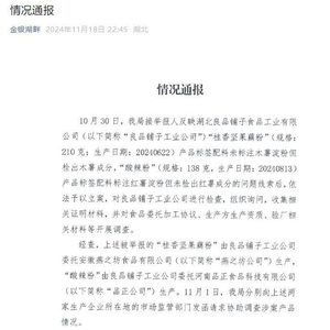 11月18日深夜,武汉市东西湖区市场监督管理局通报称,举报人反映的良品铺子涉嫌委托生产的“‘桂香坚果藕粉’检测出木薯成分”“‘酸辣粉’未检测出红薯成分”的问题并不成立。