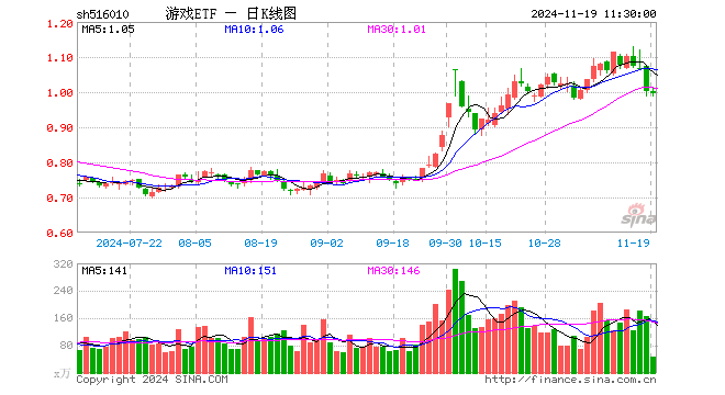 11月19日,截止午间收盘,游戏ETF(516010)跌0.50%,报0.996元,成交额4533.43万元。游戏ETF(516010)重仓股方面,昆仑万维截止午盘跌2.87%,三七互娱跌0.82%,恺英网络涨0.91%,世纪华通跌0.24%,神州泰岳涨0.16%,巨人网络跌0.72%,掌趣科技涨0.75%,光线传媒跌0.59%,完美世界涨3.96%,吉比特涨0.19%。