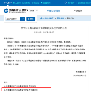 昨日,建设银行在官网发文称,因系统升级优化,将对公黄金积存业务的相关协议文本进行更新。具体而言,建行修订了《中国建设银行对公黄金积存业务协议书》、《中国建设银行对公黄金积存业务权益须知》、《中国建设银行对公黄金积存业务风险揭示书》,内容主要是优化了对公黄金积存对公钱包应用的规则。