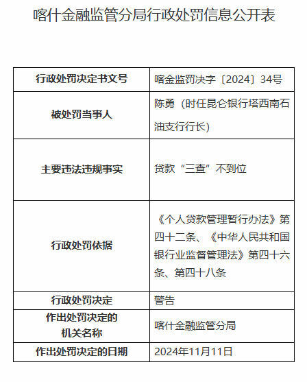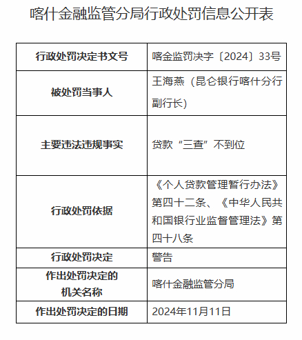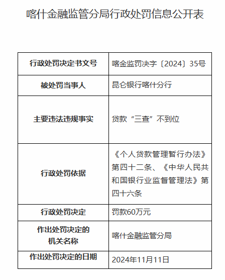 昆仑银行喀什分行因贷款“三查”不到位被罚60万元