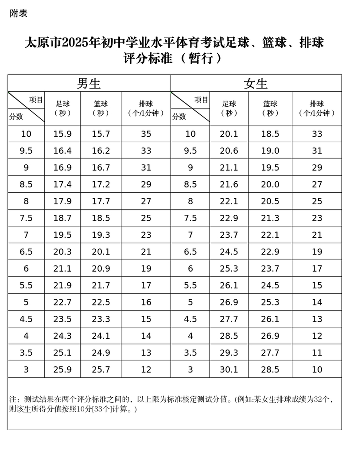附表:太原市2025年初中学业水平体育考试足球、篮球、排球评分标准 (暂行)