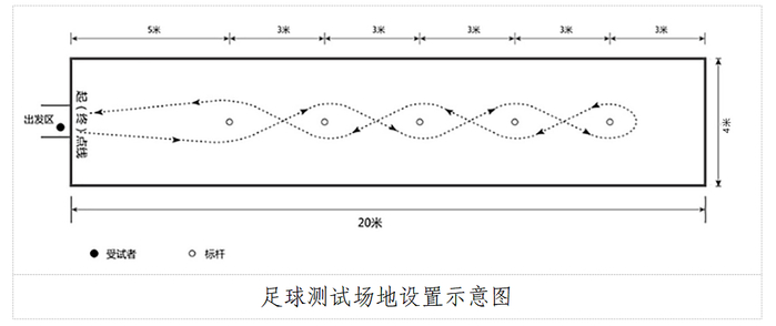 长20米,宽7米。起点线前5米处开始设置标志杆,共设5排,每排2根;各排标志杆之间相距3米,同排的两根标志杆底座中心点之间相距1米,距同侧边线3米。起点线中间1米处为出发区域。设置方式如图所示: