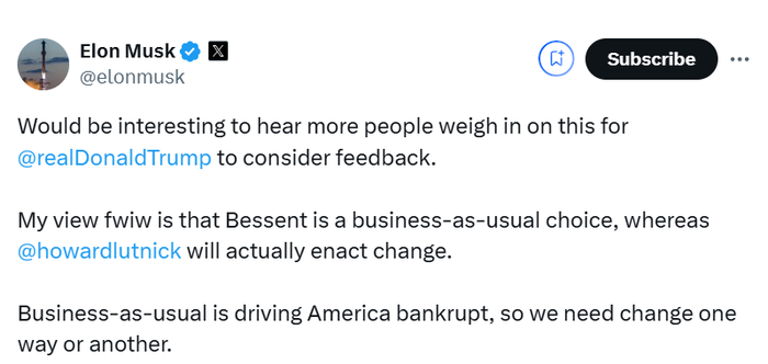 尽管如此,特朗普的一些最亲密的顾问仍在努力让这位候任总统选择一位能够改变财政部目前局面的候选人。马斯克在社交媒体上发文称: