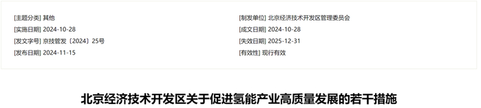 2024年11月15日,北京经开区发布了《关于促进氢能产业高质量发展的若干措施》(以下简称《措施》)。