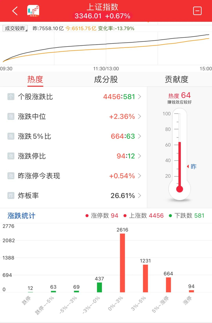创业板指缩量大涨3% 两市上涨个股近4500只 科技、新能源午后集体爆发。三大指数午后暴力拉升集体收涨,截至收盘,沪指涨0.67%,深证成指涨1.90%,创业板指涨3.00%。两市个股普涨,上涨个股近4500只;两市全天成交1.54万亿元,较上一日缩量成交2024亿元,内资主力资金净卖出276.3亿元;两市涨跌中位数为2.23%。